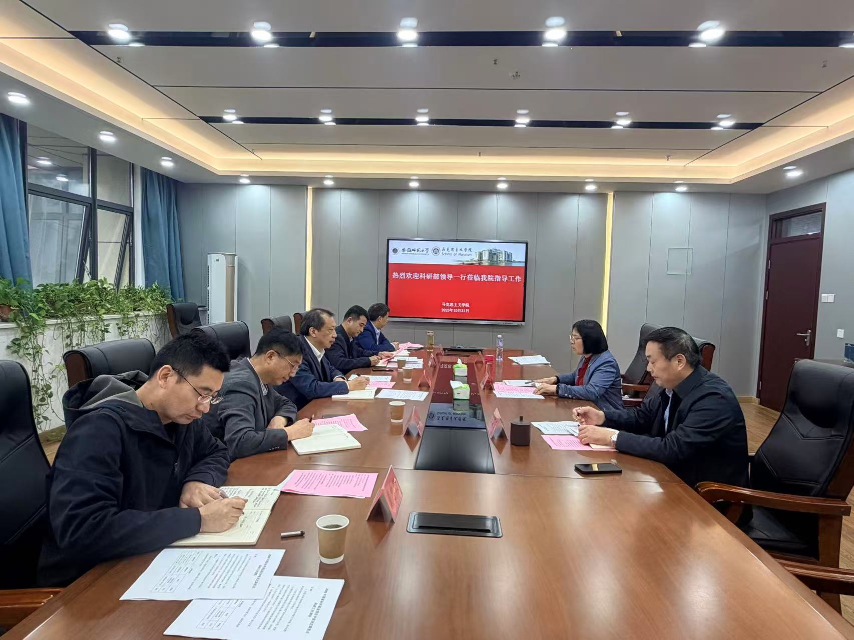 2025年10月31日上午,校科研部部长罗永龙、副部长谭书龙、曹卫东、韩家炳,文科管理科科长戴忠朝一行至学院调研。学院科研副院长汪盛玉、行政副院长余本玉以及学院科研办秘书晏艳参加会议,调研会由汪盛玉主持并进行工作汇报。