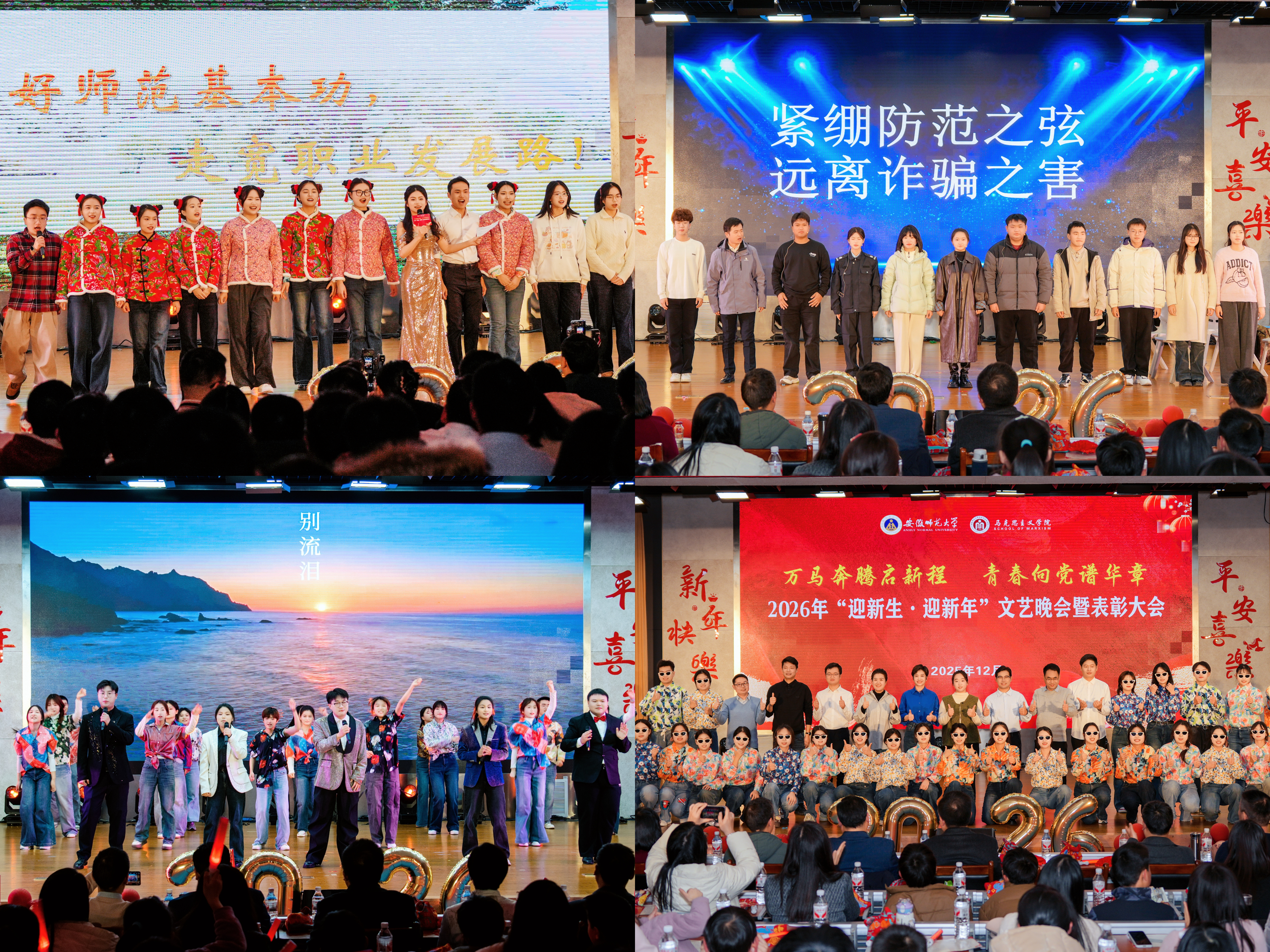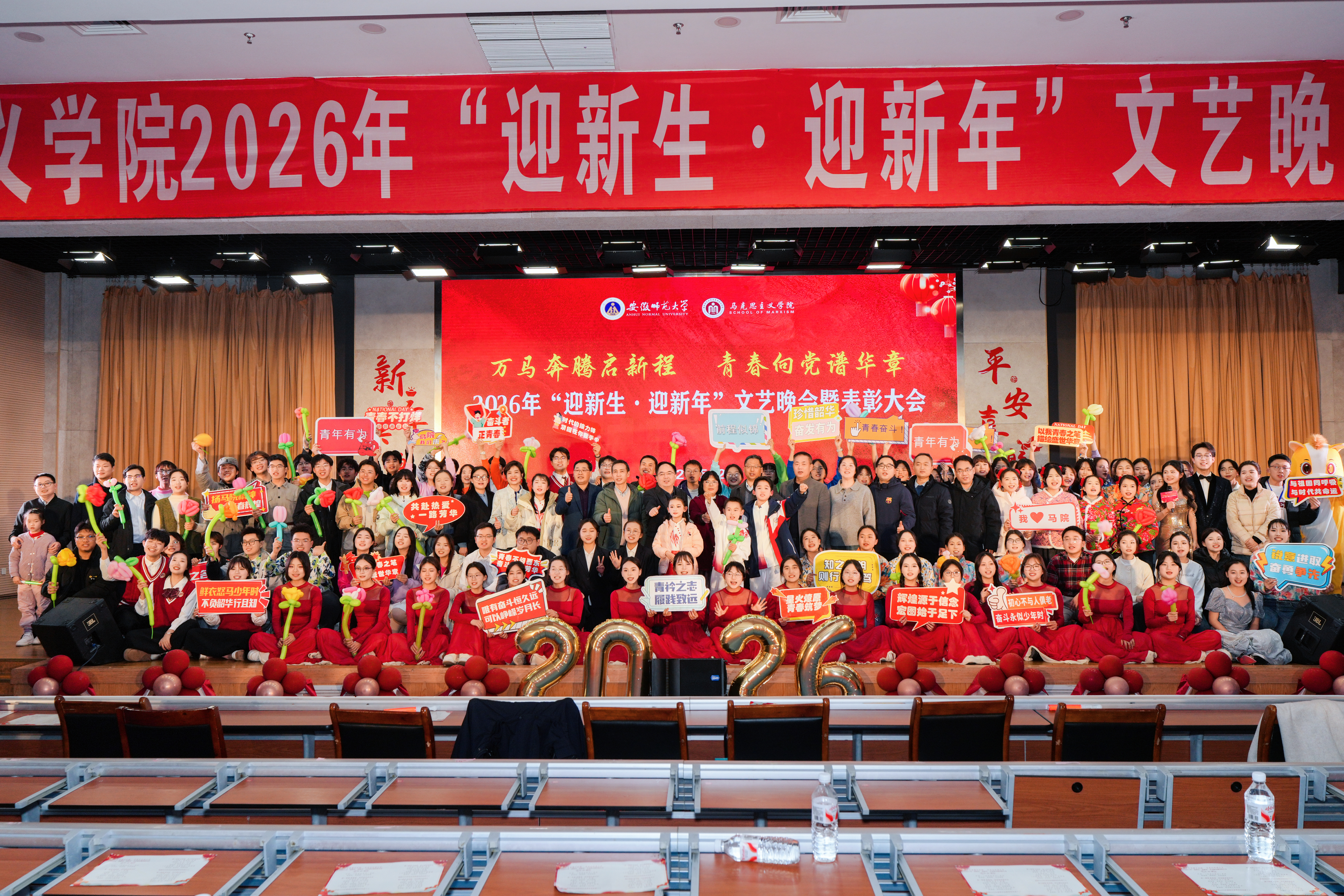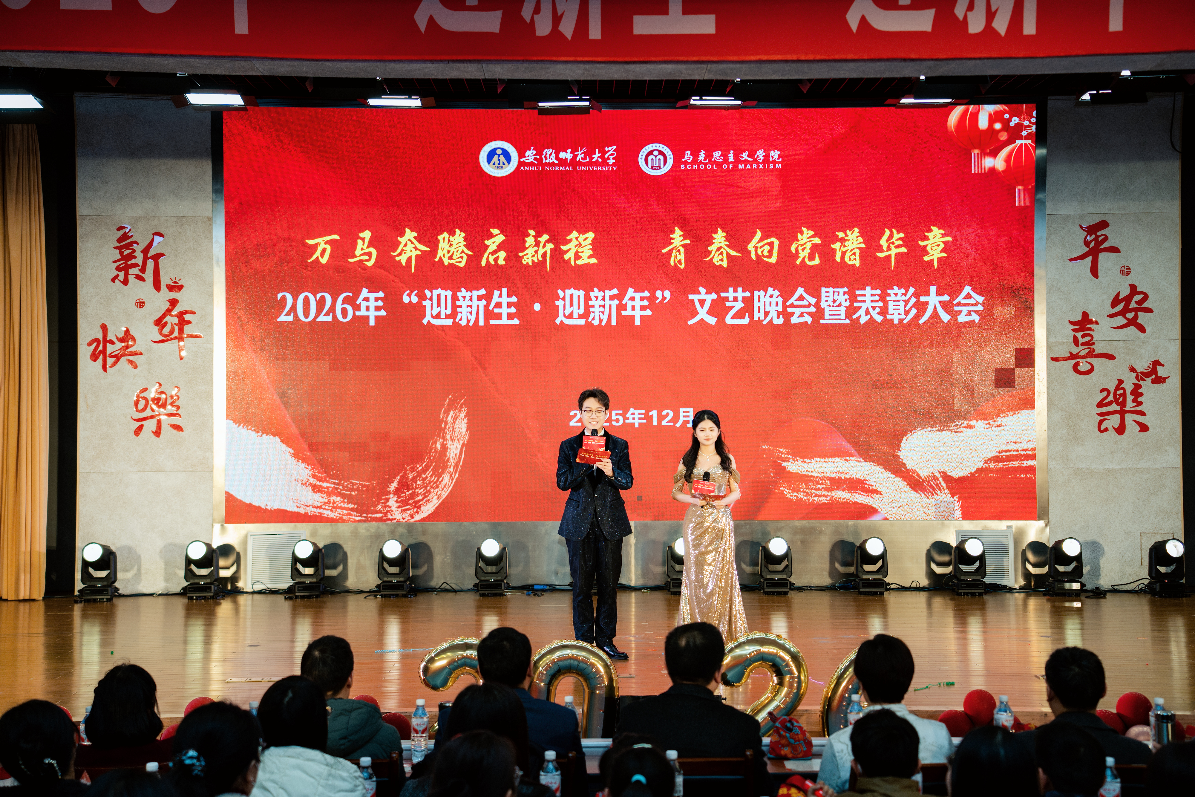 万马奔腾启新程,青春向党谱华章。12月14日晚,马克思主义学院“迎新生·迎新年”文艺晚会暨表彰大会在花津校区实习实训中心一楼报告厅倾情上演。学院院长姚宏志,学院党委副书记刘玉艳,学院副院长李祥兴,沈燕培,单传友,余本玉和700余名师生代表共同观看。