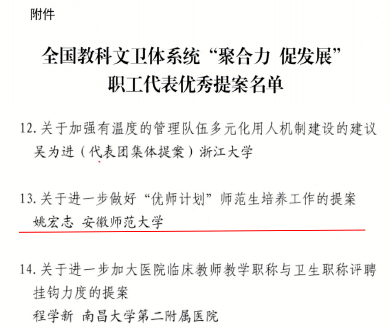 近日,中国教科文卫体工会全国委员会公布了全国教科文卫体系统“聚合力 促发展”职工代表优秀提案征集推荐结果,我院姚宏志教授撰写的《关于进一步做好“优师计划”师范生培养工作的提案》成功入选,荣登优秀提案名单,展现了我院教职工心怀“国之大者”、积极履职建言、助力教育事业发展的责任担当。