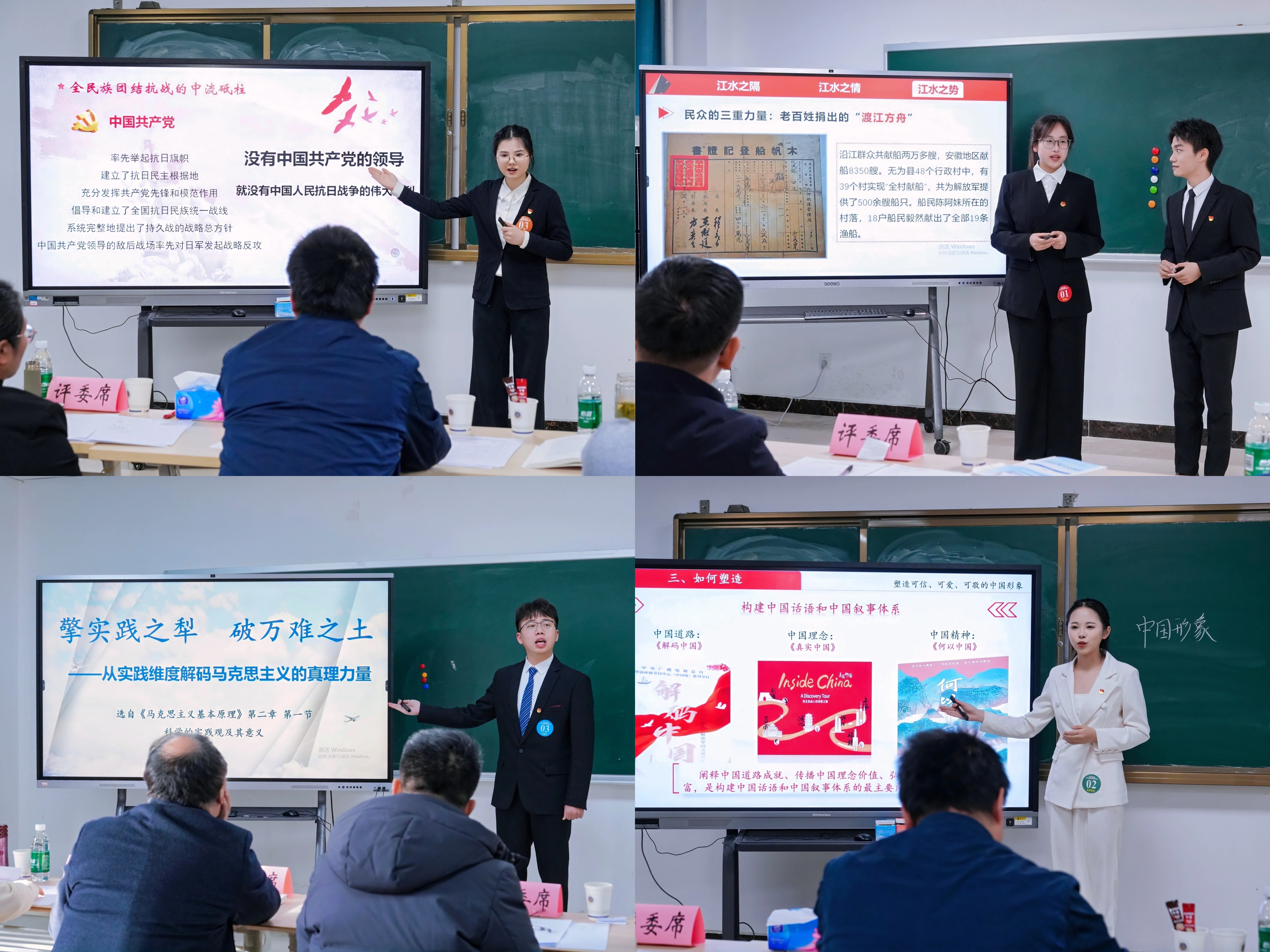 大学生讲思政课决赛活动采用现场赛的形式进行,由片赛区获奖的主讲人(皖南、皖中、皖北片赛区一二等奖选手)代表团队参加决赛。各团队围绕主题,选择《习近平新时代中国特色社会主义思想概论》《毛泽东思想和中国特色社会主义理论体系概论》《马克思主义基本原理》《中国近现代史纲要》《思想道德与法治》《形势与政策》6门课程中的有关章节或专题进行现场讲课,评委专家组从教学设计、教学内容、语言教态等方面进行现场评分。比赛中,参赛选手们立足江淮大地发展实践,将党的创新理论与地方实际深度融合。他们以青年大学生的独特视角,用青春话语讲活中国故事、弘扬中国精神,充分展现了当代大学生扎实的马克思主义理论素养和昂扬向上的精神风貌,让思政课堂充满青春热度与思想高度。