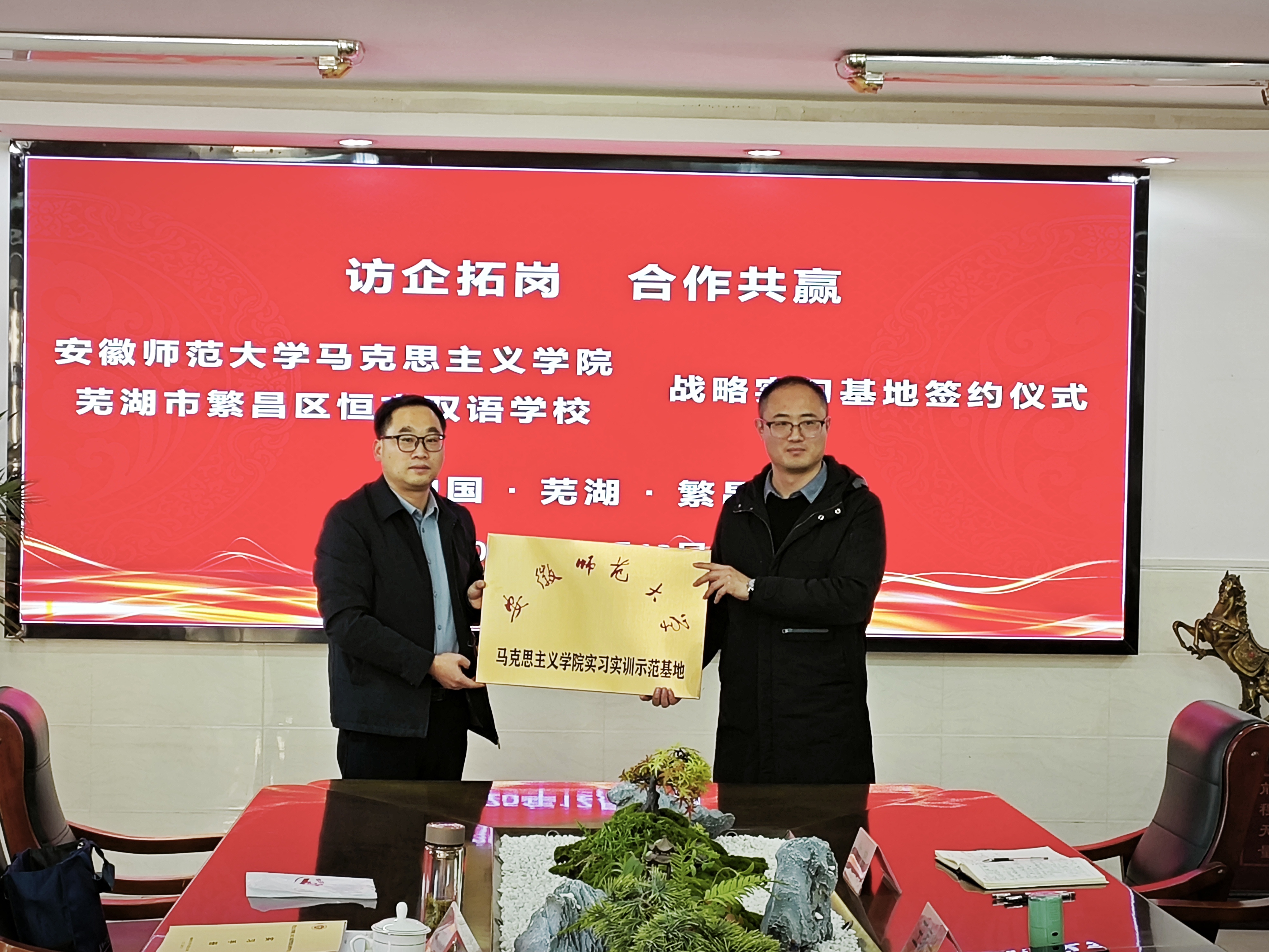 座谈会上,刘继虎表示此次授牌是安徽师范大学马克思主义学院对恒杰双语学校办学质量和学生素质的充分信任和肯定。随后刘继虎介绍了恒杰教育集团及恒杰双语学校的办学历史、办学理念、师资队伍建设和特色教育成果等情况,重点阐述了学校在思政教育实践方面的探索与需求,表达了与高校共建实践基地、深化协同育人的迫切愿望。刘玉艳代表马克思主义学院对恒杰双语学校的热情接待表示感谢,向恒杰教育集团、恒杰双语学校出席领导详细介绍了学院的学生整体情况、专业发展情况、近几年学生就业教师行业发展情况以及近年来在服务地方教育发展方面的举措与成效,并表示此次签约是双方多次深入交流的成果,希望双方能够以签约为契机,将合作落到实处,实现共育人促就业的共赢目标。单传友重点介绍学院学科建设、师资力量、人才培养目标及课程体系设置等情况。他提到,学院始终聚焦师范生核心素养培育,培养了一批批政治素质过硬、理论功底扎实、教学能力突出的优秀毕业生。希望通过与恒杰双语学校的深度合作,为学生提供更优质的实习实训平台,让学生在真实的教育教学情境中提升专业技能和综合素养。随后单传友与王家兴分别代表双方签署了合作协议,刘玉艳副书记与刘继虎校长共同为“实习实训示范基地”和“协同育人基地”揭牌。
