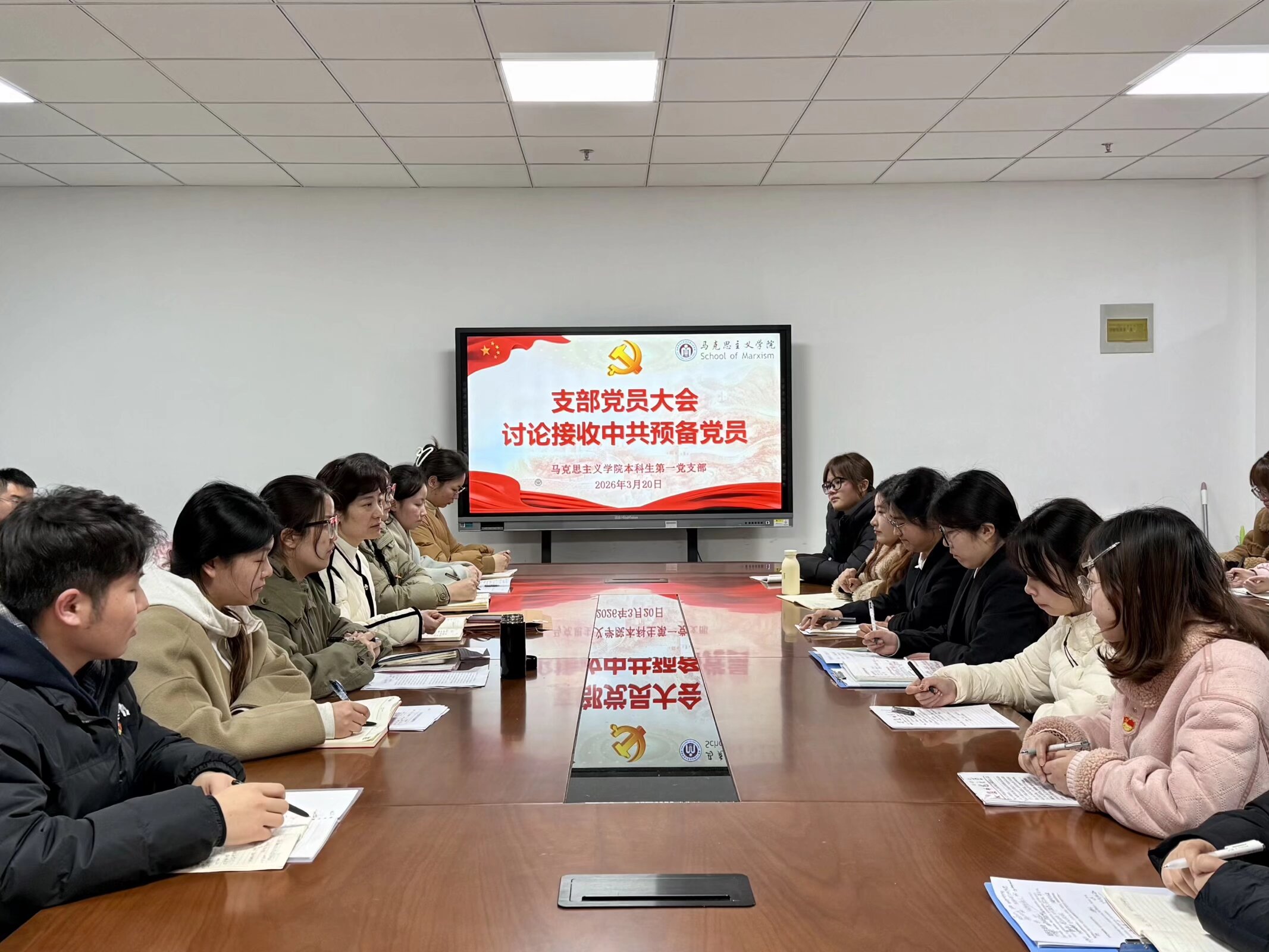 3月20日下午,马克思主义学院本科生第一党支部在文典楼G211会议室召开支部大会,讨论接收中共预备党员相关事宜。院党委副书记刘玉艳出席会议,会议由支部书记陶娴静主持,全体党员参加。