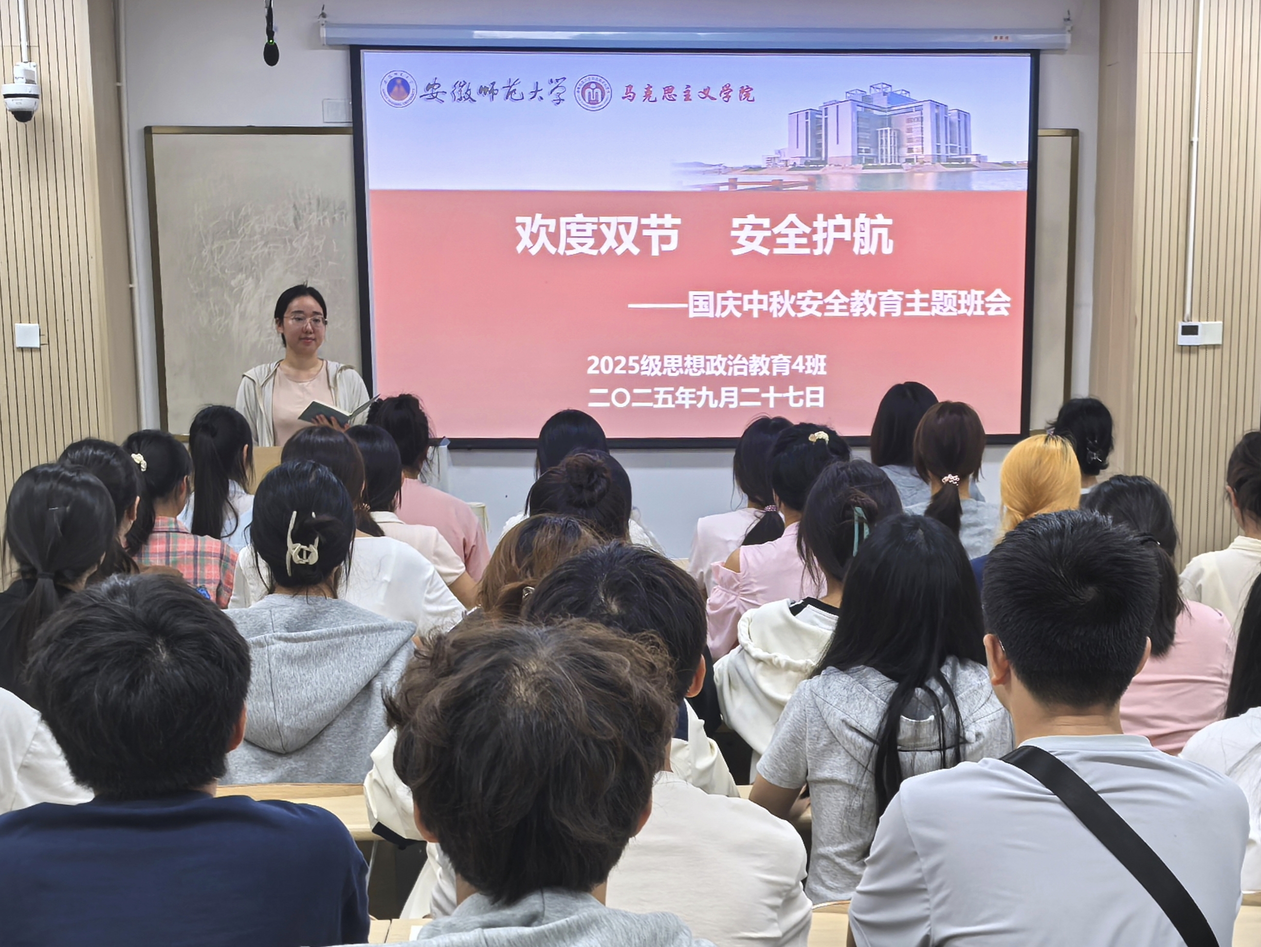 中秋月圆,国庆同至。为切实增强学生的安全防范意识,确保全体学生度过一个平安、愉快的假期,9月27日晚,学院2025级思想政治教育专业4班在望道楼E204教室组织召开“欢度双节 安全护航”主题班会。由辅导员许雯主持,全体同学参加。