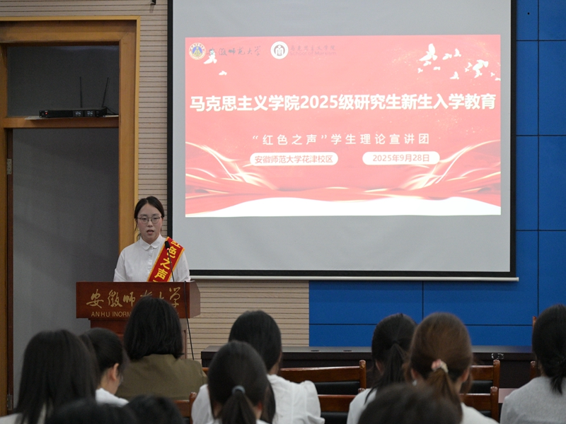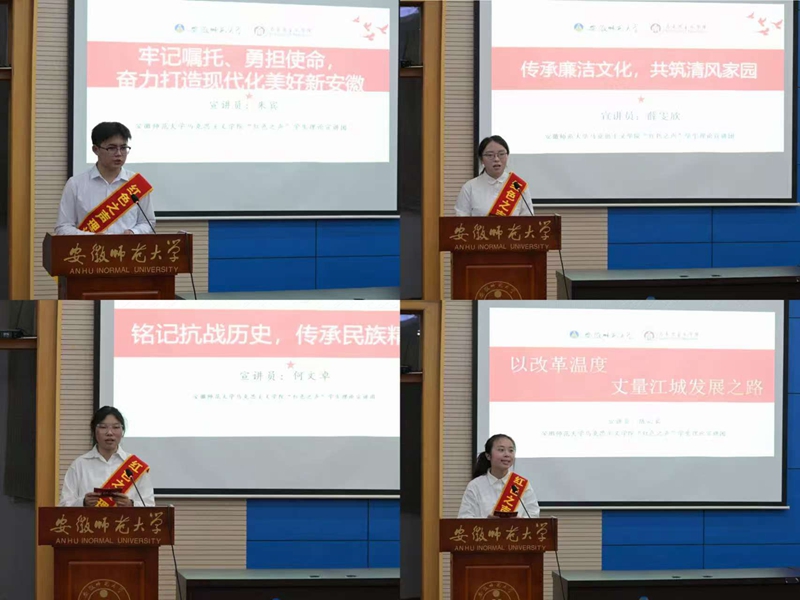 “红色之声”理论宣讲团朱宾带来《牢记嘱托、勇担使命,奋力打造现代化美好新安徽》主题宣讲,围绕安徽发展使命,深刻阐释青年与地方共奋进的责任;薛雯欣以《传承廉洁文化,共筑清风家园》为题展开宣讲,聚焦廉洁文化建设,为新生们传递廉洁正能量;朱宾、薛雯欣、陈沁茹、何文卓共同带来朗诵《青春中国》,用饱含深情的声音抒发青春对祖国的礼赞,展现新时代青年担当;何文卓进行《铭记抗战历史,传承民族精神》的宣讲,带领现场新生回溯烽火岁月,唤起大家对民族精神的强烈共鸣;陈沁茹开展《以改革之路丈量江城发展之路》的宣讲,结合江城地域文化与改革实践,解读发展背后的理论与实践逻辑。