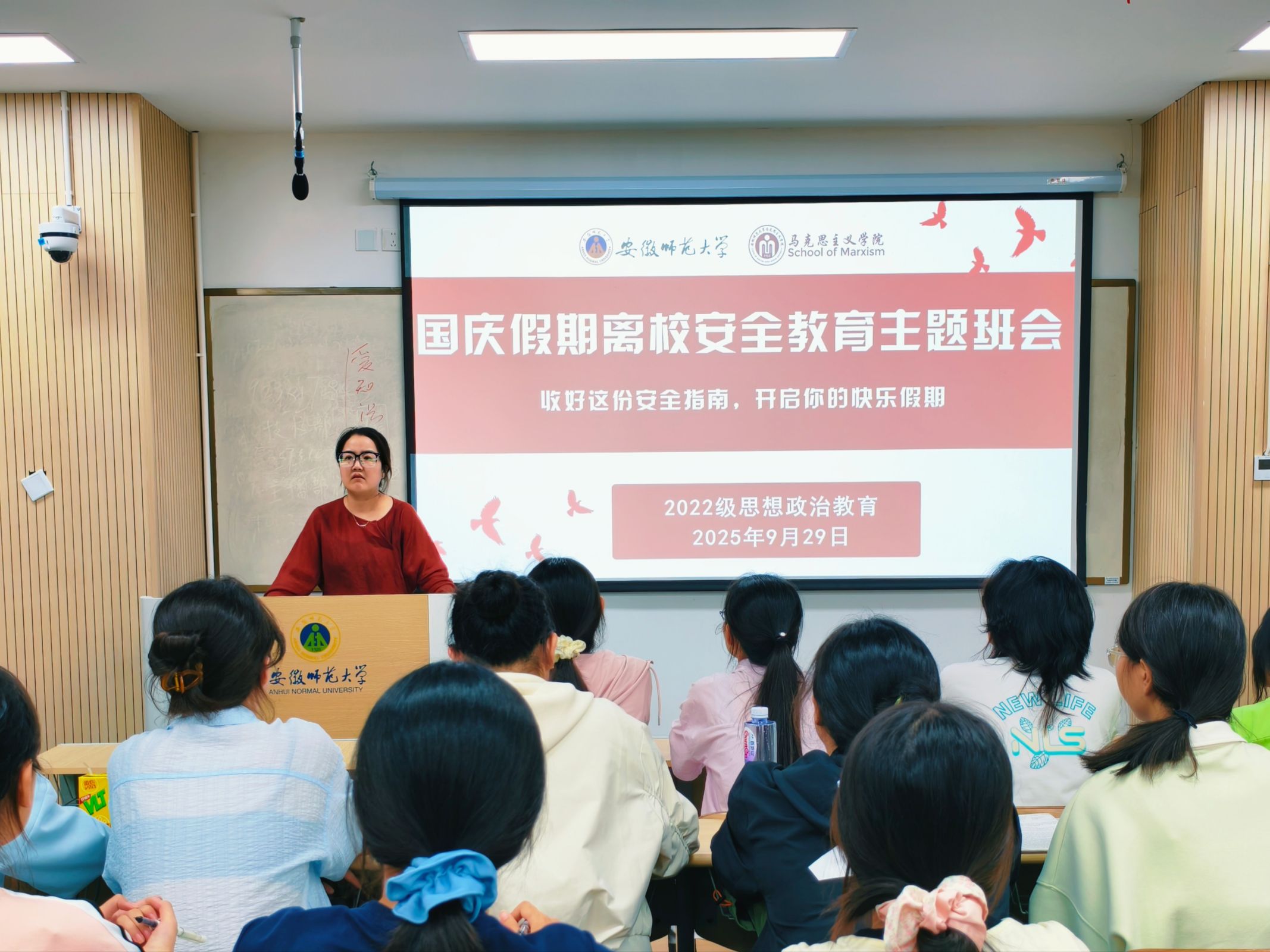9月29日晚,学院2025级思想政治教育教学1班在望道楼E205教室召开国庆假期离校安全教育主题班会。会议由辅导员陶娴静主持,全体同学参加。