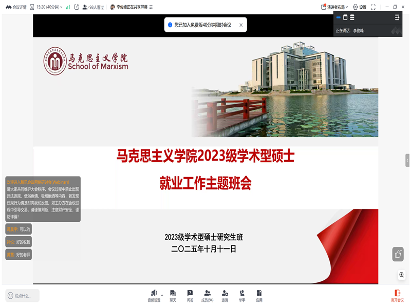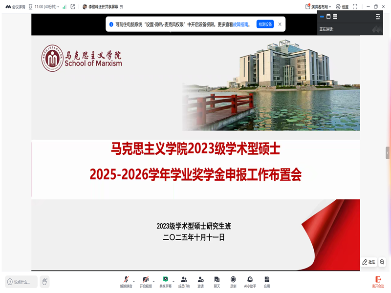 10月11日晚上,2023级学术型硕士研究生班在线上召开2025-2026学年学业奖学金申报工作和就业工作动员会。本次班会由辅导员李俊峰主讲,班级全体同学参加。