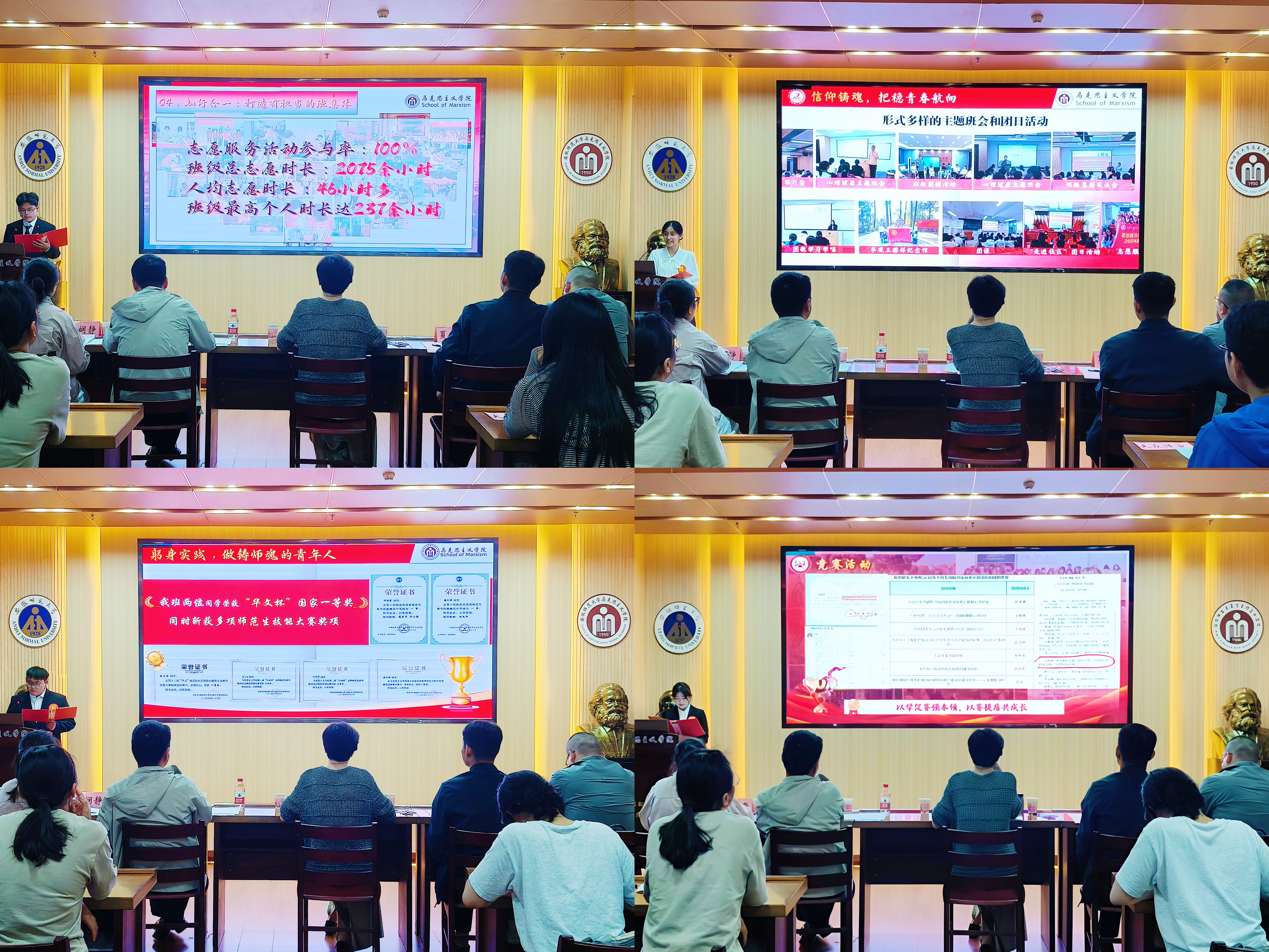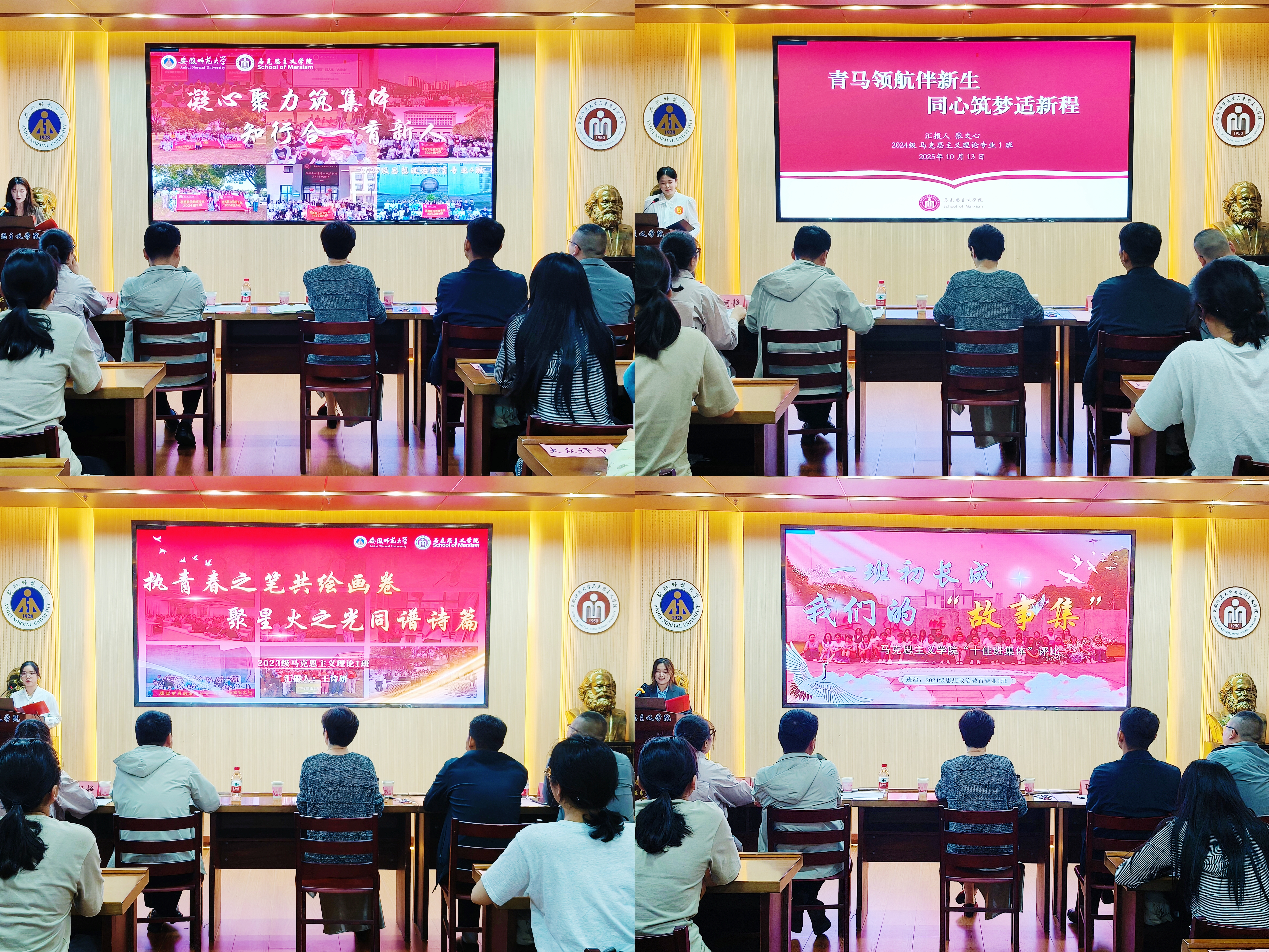 经审核筛选,本次共计9个班级参与评选。22级思政4班以思想引领、学风建设、实践成效为主线,勾勒班级建设的全景画卷;23级马理论1班以志愿服务践行奉献精神,锻炼实践能力,磨砺意志力;24级马理论1班依据共同价值追求,涵养纯正班风,厚植优良学风;24级思政4班知行并进,铸思想之魂,强学业之基,展现卓越的成长风采。