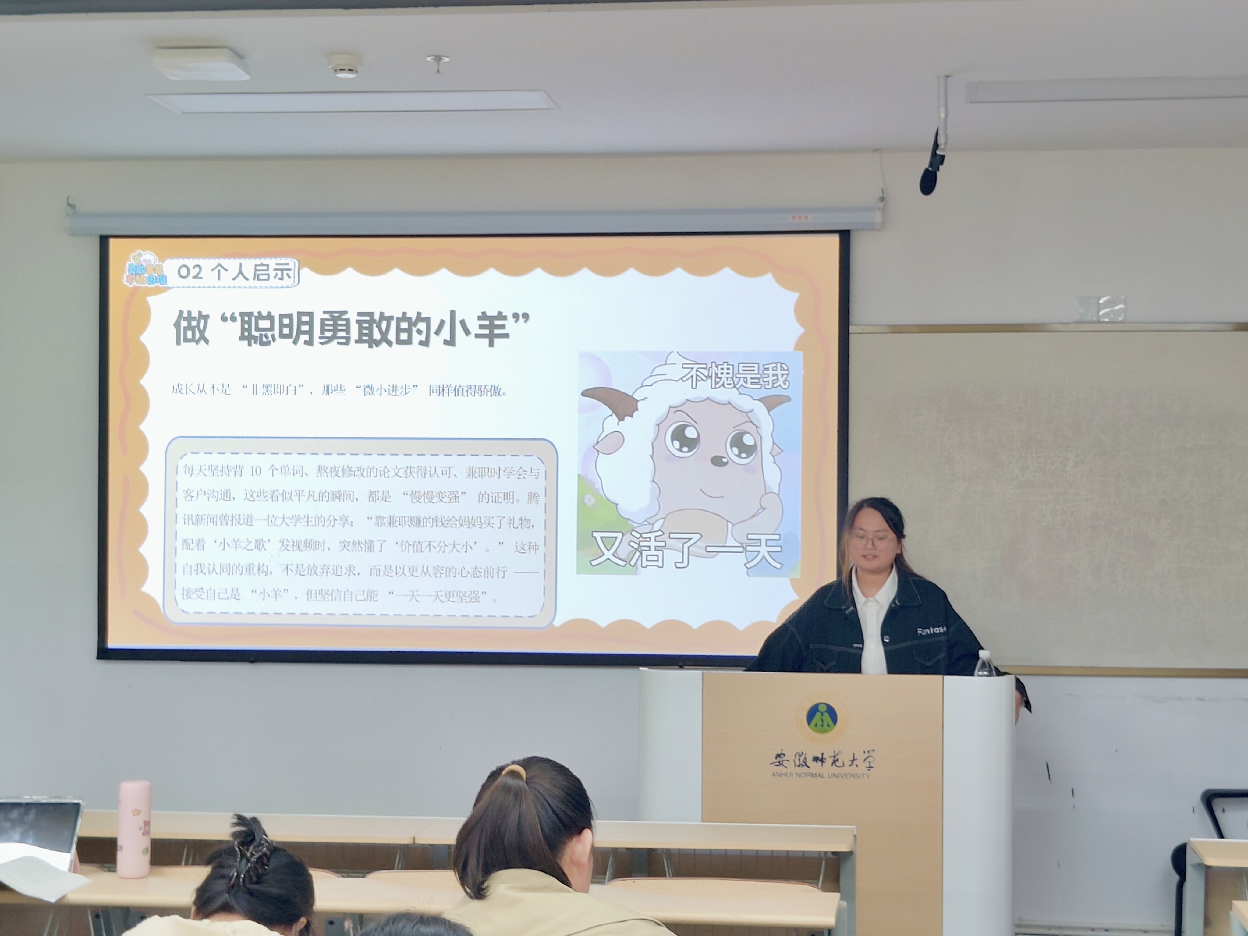 班会通过生动案例阐释了心理健康对大学生成长的重要性。同学们通过情景模拟深入探讨了情绪稳定、情感丰富、社交能力和自我认知四大标准。针对大学生常见的焦虑、抑郁等问题,班级同学分享了了积极心态塑造、情绪调节技巧等实用方法。同学们通过小组讨论,分享了各自的心理调适经验,现场互动热烈。