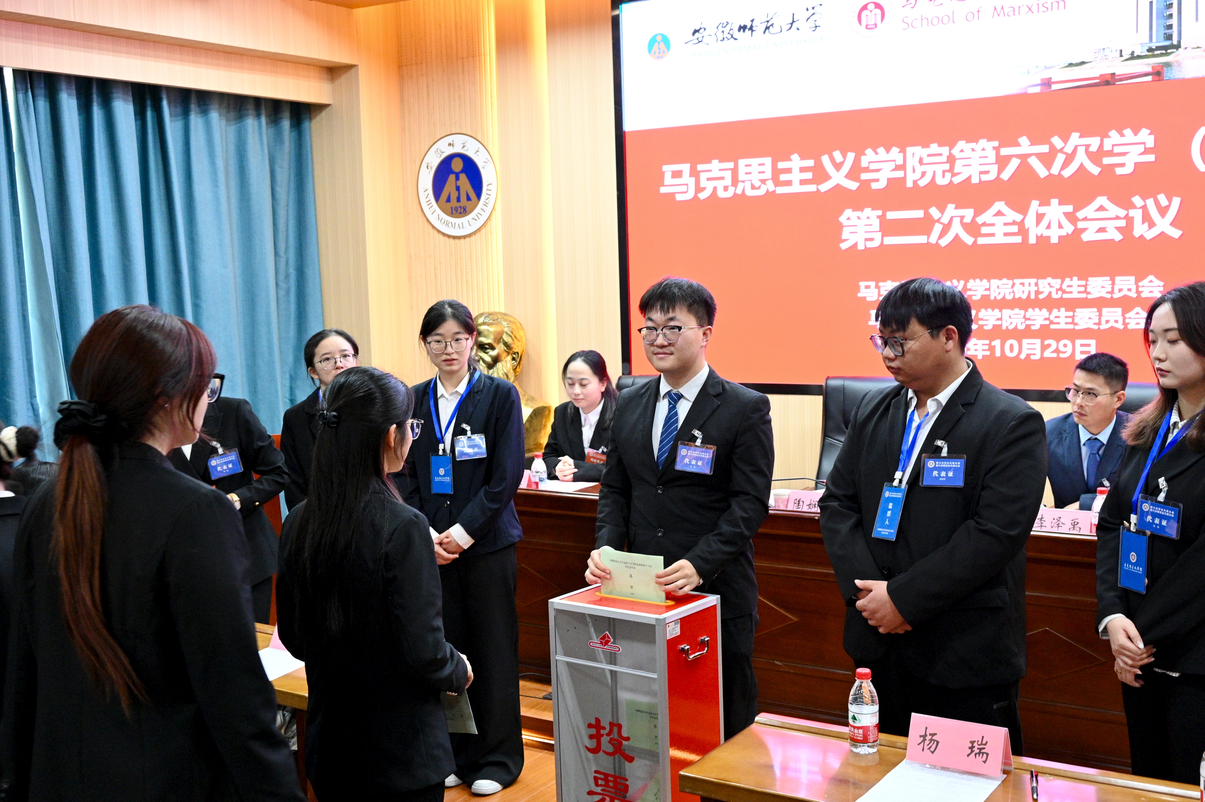 正式会议在庄严的国歌声中拉开帷幕。在开幕式暨第一次全体会议中,刘玉艳为大会致开幕词。她对大会的召开表示热烈的祝贺,对过去一年学生会和研究生会的工作给予肯定,号召广大青年学生要筑牢信仰之基,做政治坚定的追光者;要锤炼过硬本领,做知行合一的实干者;要勇于担当作为,做复兴路上的奋进者;要涵养高尚品德,做德才兼备的践行者。随后,学院学生会主席团成员任凯琪、研究生会主席团成员李泽禹分别对过去一年的学生会和研究生会的工作进行了报告。大会第二次会议通过了《安徽师范大学马克思主义学院出席校学(研)代会代表选举办法》《安徽师范大学马克思主义学院第六届学生会(研究生会)主席团、学生(研究生)委员会委员选举办法》等系列草案,并选举出学院参加校学代会、研代会的代表、学生委员会、研究生委员会成员以及院学生会、研究生会主席团成员。