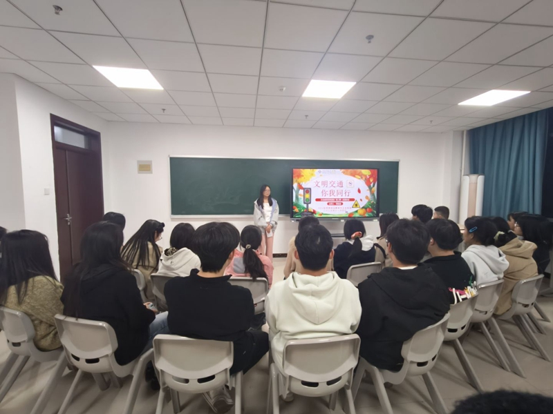 活动中,曹露露结合相关数据,强调了交通安全对于保障人民群众幸福感与安全感的重要作用。随后,她从行走、骑车和驾车三类常见出行场景切入,系统讲解了安全出行的基本常识,并针对校内遇车、车辆剐蹭、人群拥挤等突发情况,提供了具体的避险与求助方法。最后,活动通过趣味小测试检验学生们的学习成效,引导大家巩固“斑马线通行规则”和“全员系安全带”等交通安全知识。
