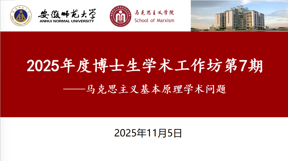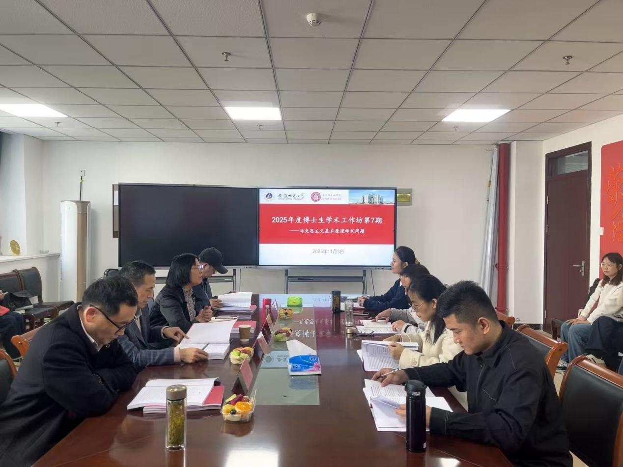 2025年11月5日下午15:00,安徽师范大学马克思主义学院在学院四楼402会议室成功举办2025年度第7期博士生学术工作坊活动,本次工作坊主题为“马克思主义基本原理学术问题”。马克思主义基本原理博士学位点导师彭启福、戴兆国、汪盛玉、单传友等教授出席指导。本次活动由学院副院长、马克思主义基本原理博士学位点负责人汪盛玉主持,马克思主义基本原理学位点博士生闫爽、张启磊、张敏、张轩宁和其他各年级以及其他博士学位点研究生等20余人参加。