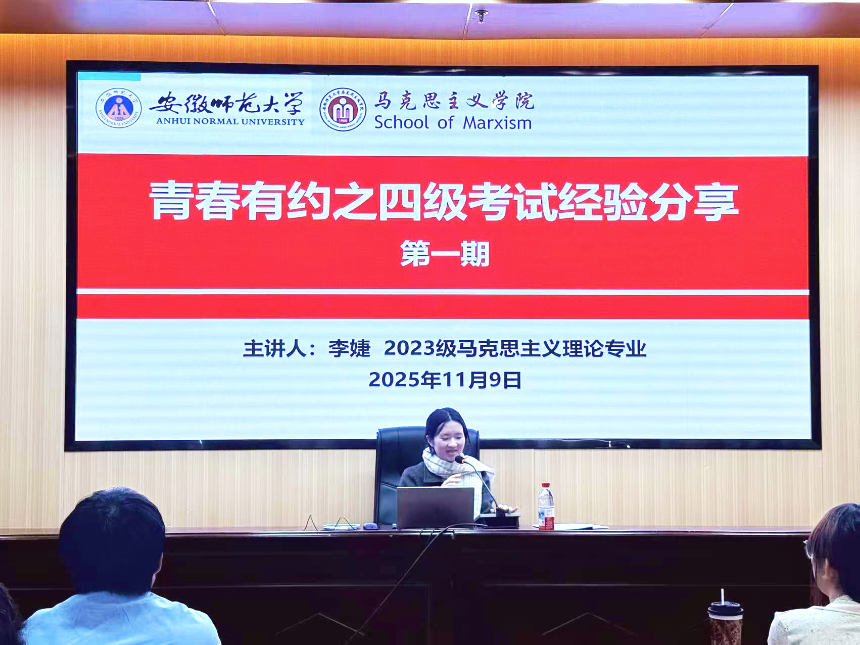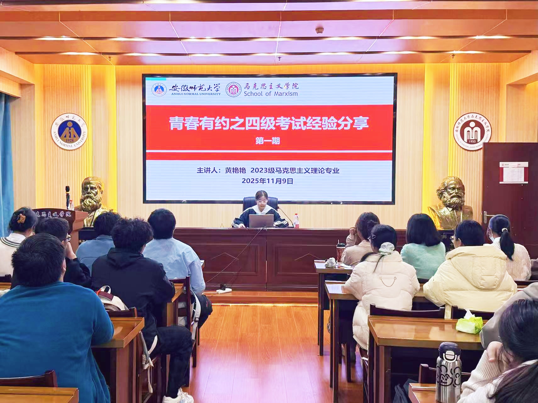2025年11月9日晚,马克思主义学院2025级马克思主义理论专业在学院108教室举办“青春有约之四级考试经验分享”讲座,2023级马克思主义理论专业黄艳艳、李婕主讲,辅导员王梦雨主持,全体学生共同参与。