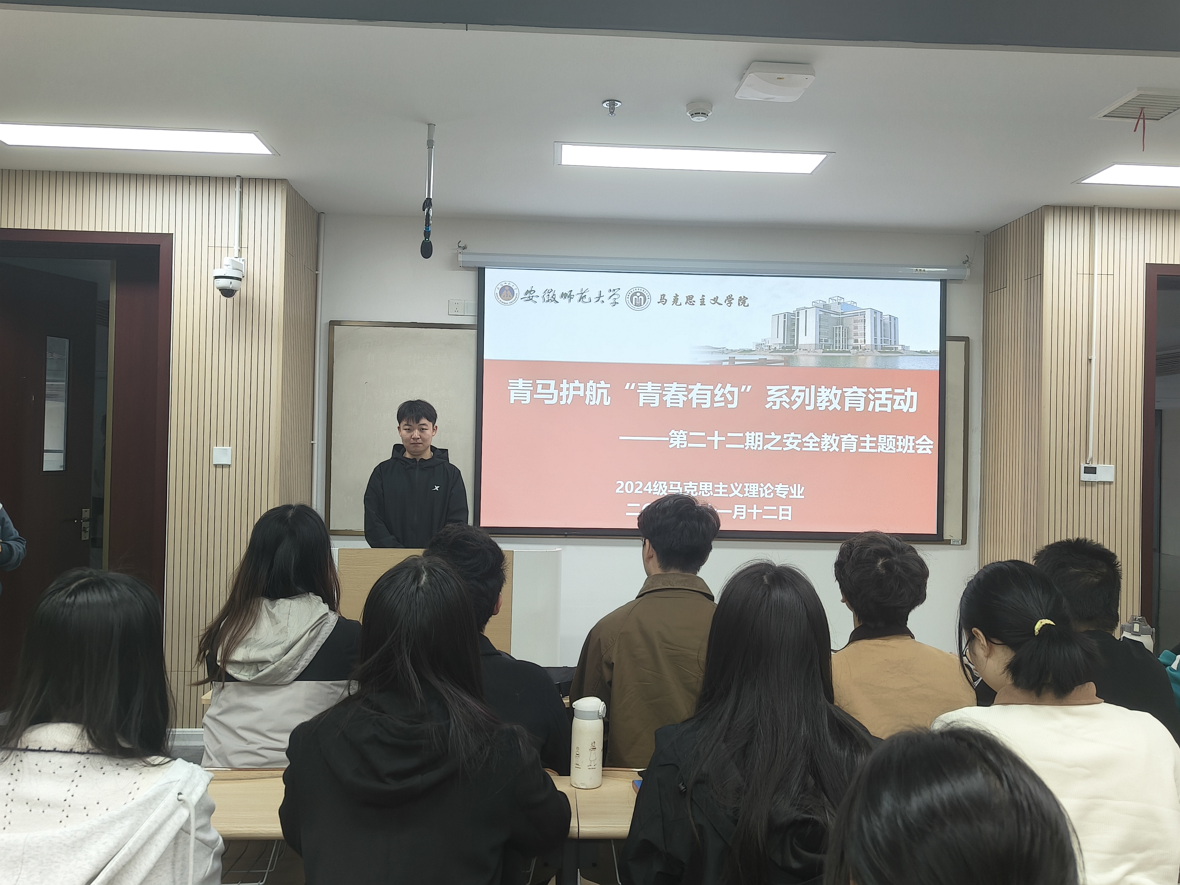 11月12日上午,2024级马克思主义理论专业在望道楼E203教室举办了安全教育主题班会。活动由安全委员张羽主持,全体同学参加。