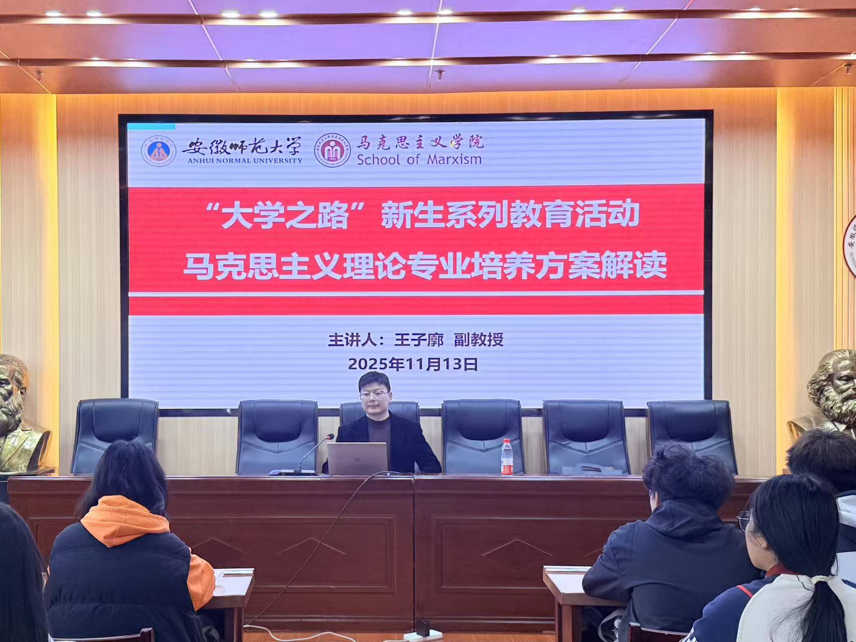 为帮助新生明晰专业学习方向、筑牢学业发展根基,11月13日,2025级马克思主义理论专业本科生在学院教室顺利开展“大学之路”新生系列教育活动——《大学之纲》专业培养方案解读。本次讲座由学院马克思主义理论专业负责人王子廓副教授主讲,辅导员王梦雨主持,全体学生共同参与。