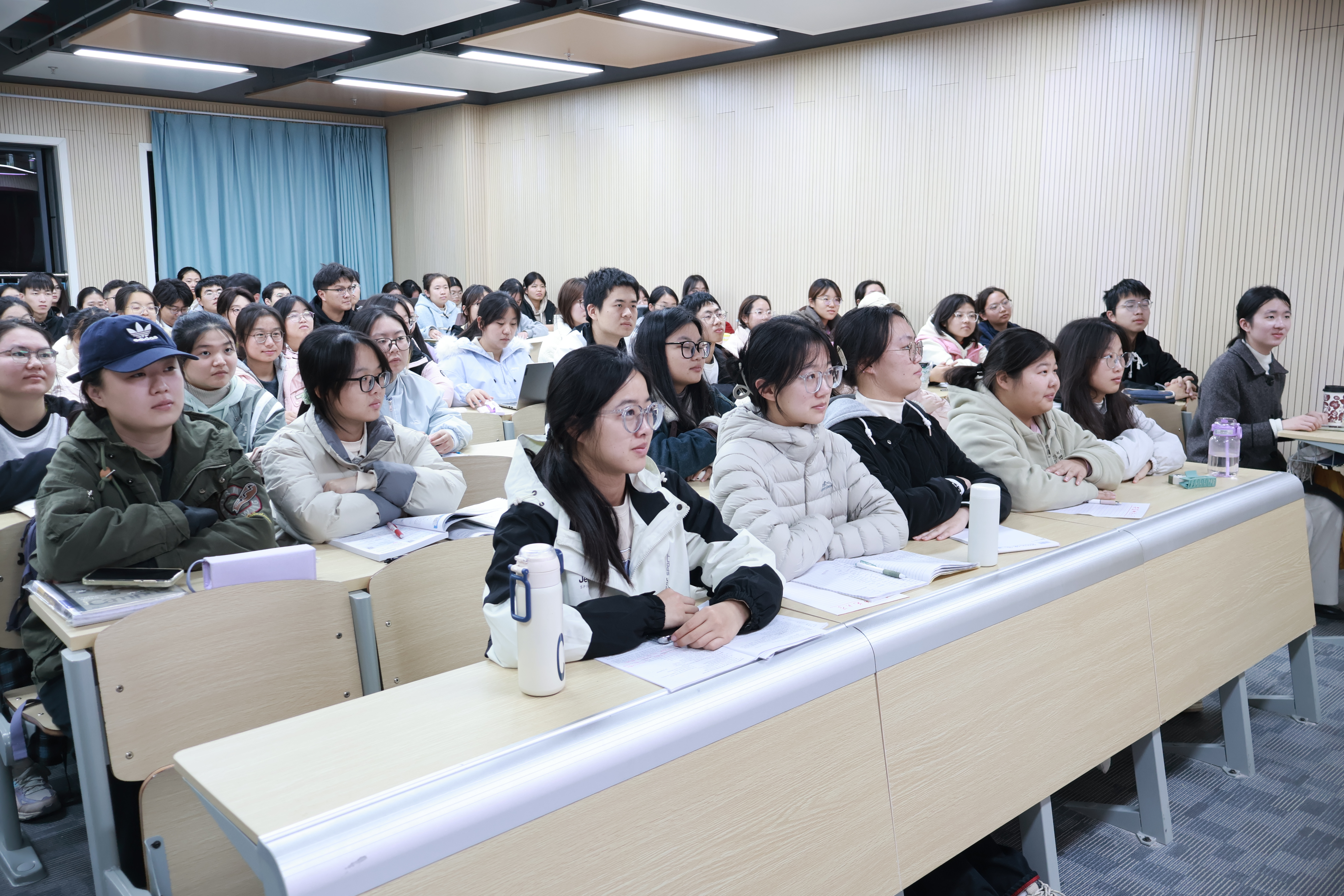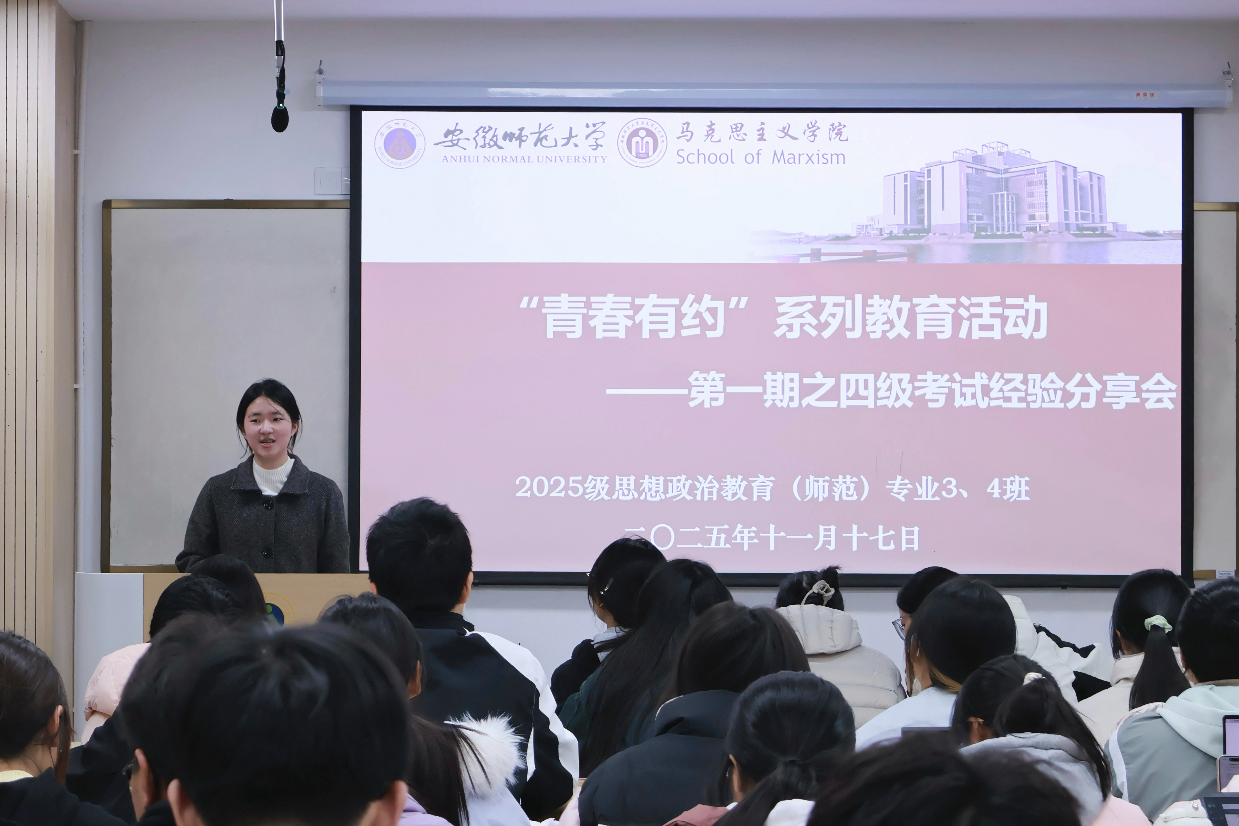 为助力2025级新生高效备战大学英语四级考试,11月17日晚,2025级思想政治教育3、4班在望道楼E204教室共同开展“青春有约”系列教育活动第一期——四级考试经验分享会,活动由辅导员许雯主持,2023级马克思主义理论专业李婕主讲,3班、4班全体同学参与。
