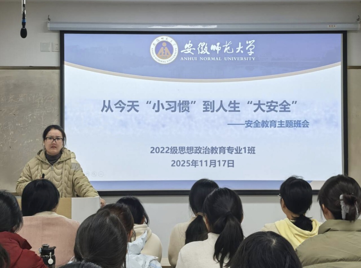 11月17日晚,学院2025级思想政治教育教学1班在望道楼E205教室召开冬季安全教育主题班会。班会由辅导员陶娴静主持,班级全体同学参加。