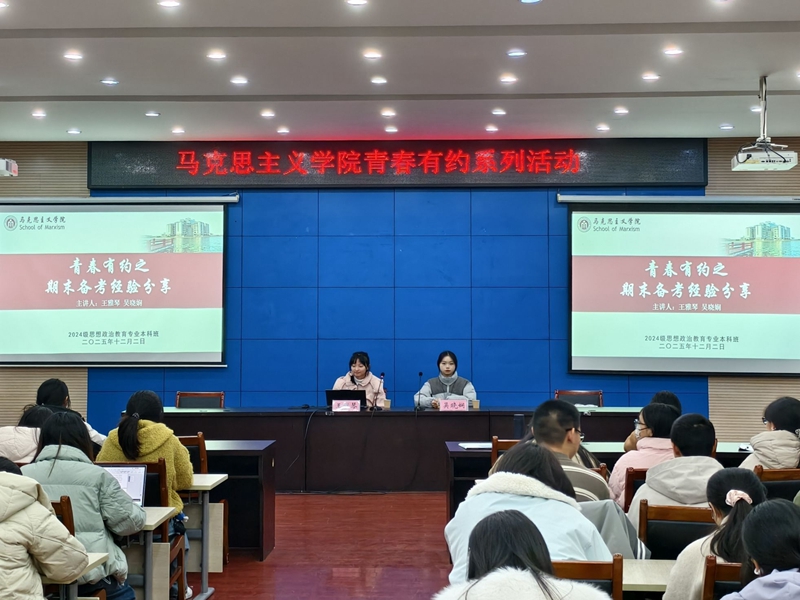 12月2日晚,马克思主义学院2024级思想政治教育专业本科班在会议中心第三报告厅开展青春有约之期末备考经验分享活动。本次活动由2023级本科生王雅琴、吴晓娴主讲,林生荣主持,全体同学参与。