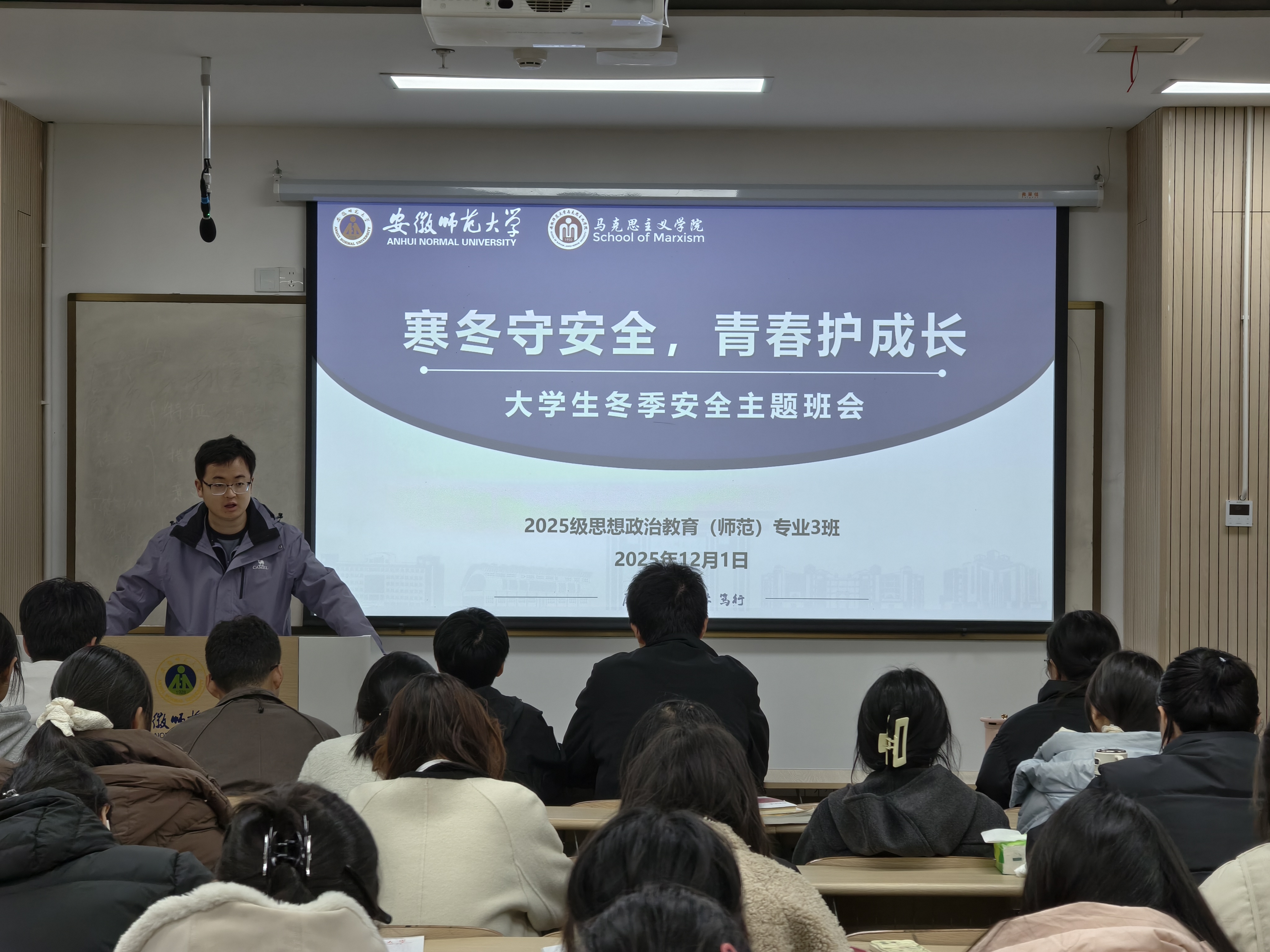 12月1日晚,马克思主义学院2025级思想政治教育3班在望道楼E207教室召开“寒冬守安全,青春护成长”冬季安全主题班会。会议由辅导员周勤松主持,班级全体同学共同参与。