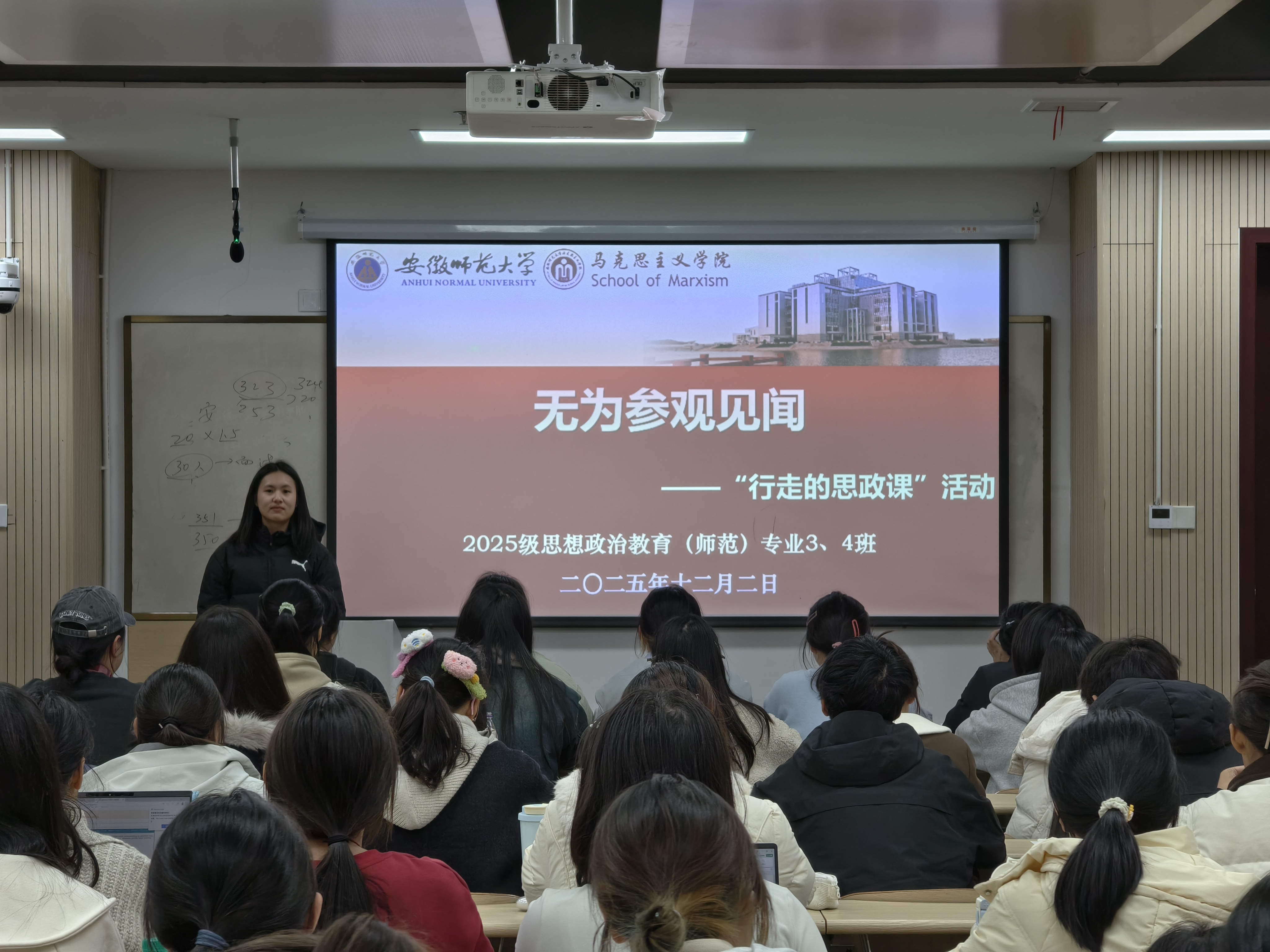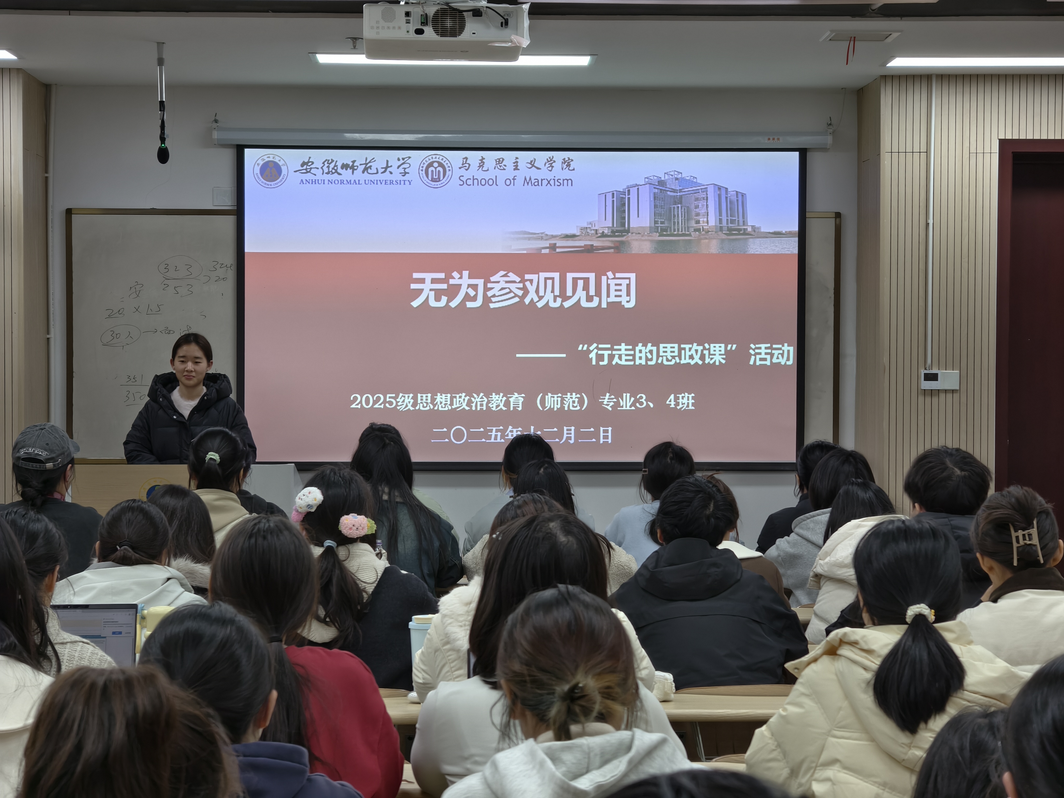 12月2日上午,马克思主义学院2025级思想政治教育3班、4班在望道楼E203教室举办“行走的思政课”活动之无为参观见闻分享会。活动由思想政治委员胡可、冯翠晶共同主持,2025级思想政治教育3班、4班全体同学参与。