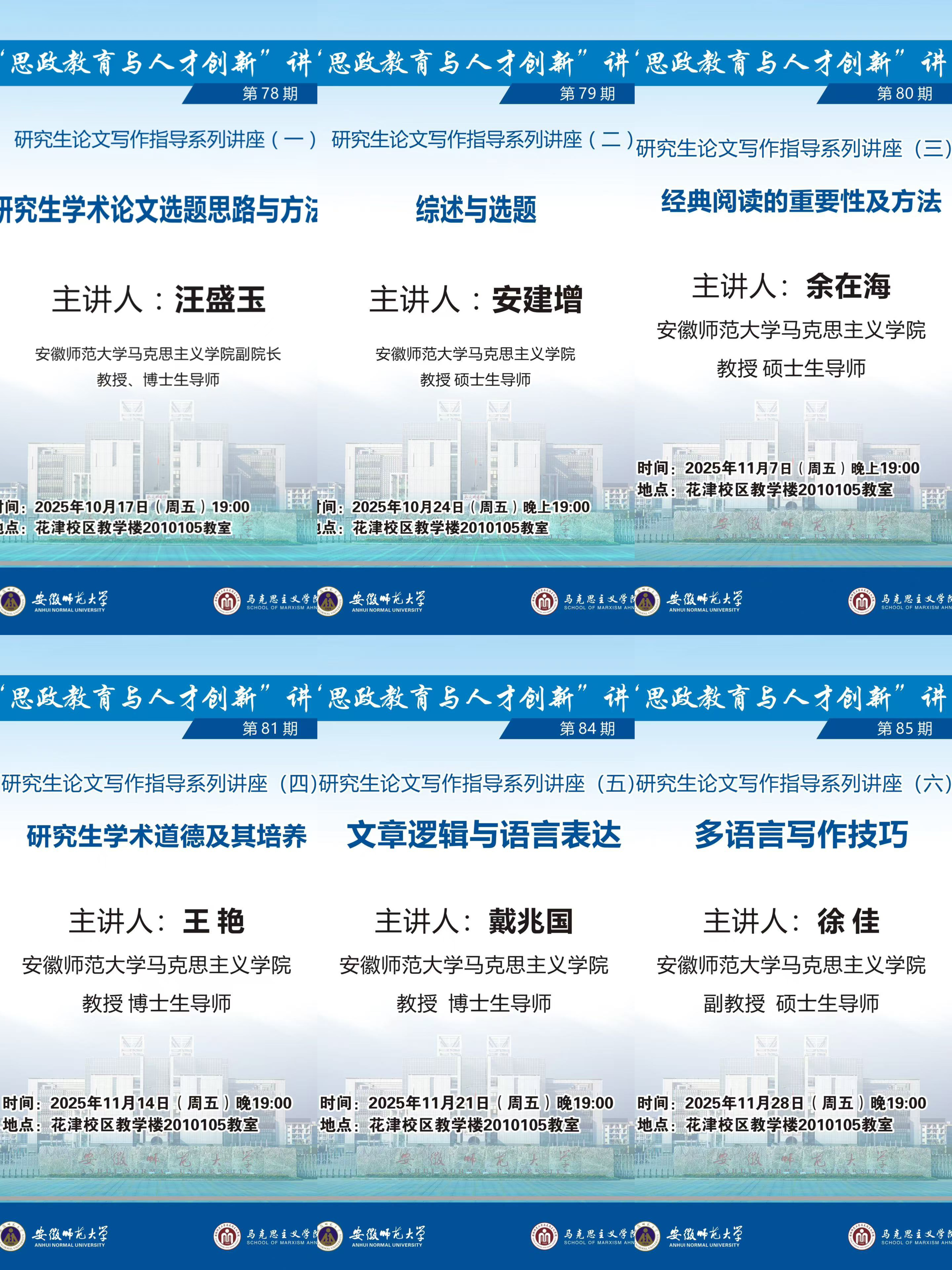 系列讲座先后开展六期,分别由汪盛玉教授、安建增教授、余在海教授、王艳教授、戴兆国教授、徐佳副教授主讲,每期讲座选题各异、主题鲜明,从不同角度对研究生论文写作过程中可能出现的问题进行了深入浅出的讲解。
