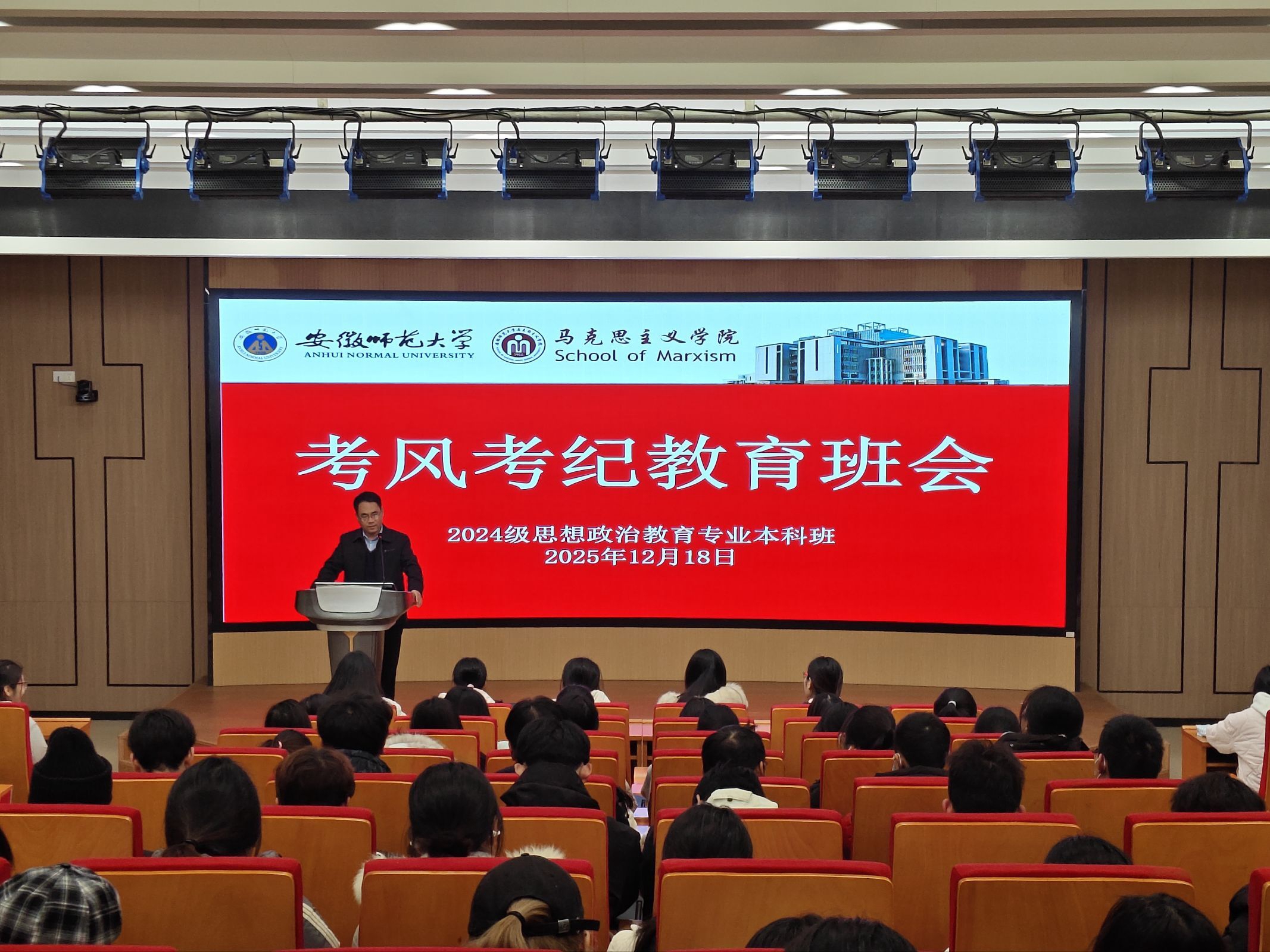 12月18日晚,马克思主义学院2024级思想政治教育专业本科班在望道楼E102报告厅召开考风考纪教育班会。班会由辅导员周楠主持,全体同学参加。