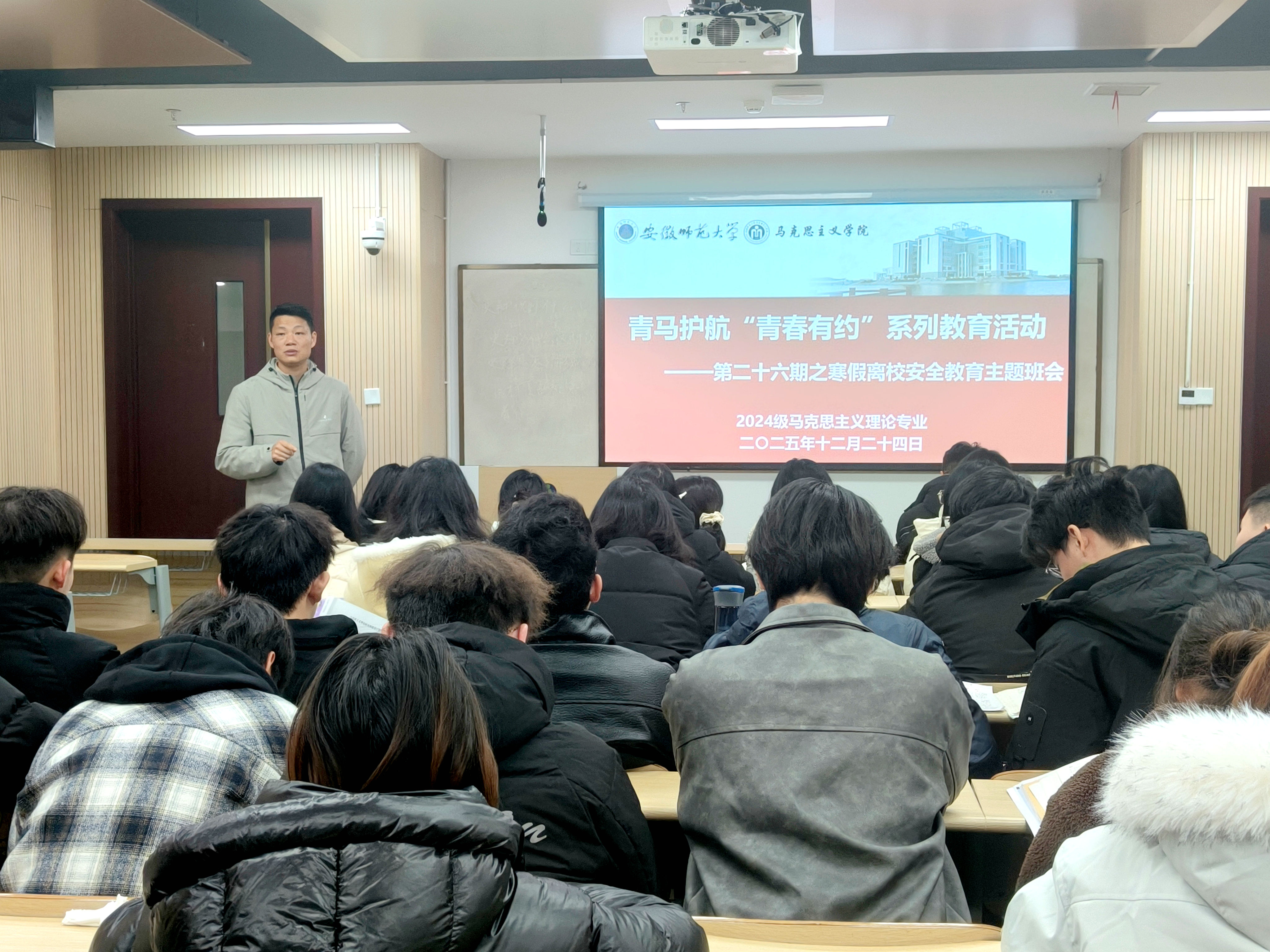12月24日上午,2024级马克思主义理论专业于文典楼E203教室召开寒假离校安全教育主题班会。班会由辅导员夏盼盼老师主讲,全体同学参加。