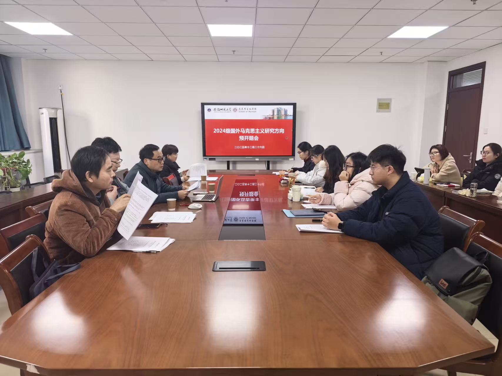 2025年12月26日上午九点,国外马克思主义硕士学位点在马克思主义学院G211会议室举行2024级学位论文预开题汇报会。汇报会由审核组组长单传友老师主持,吴兴华老师、陈旭东老师和王子廓老师担任审核组成员,2025级全体同学现场观摩学习。