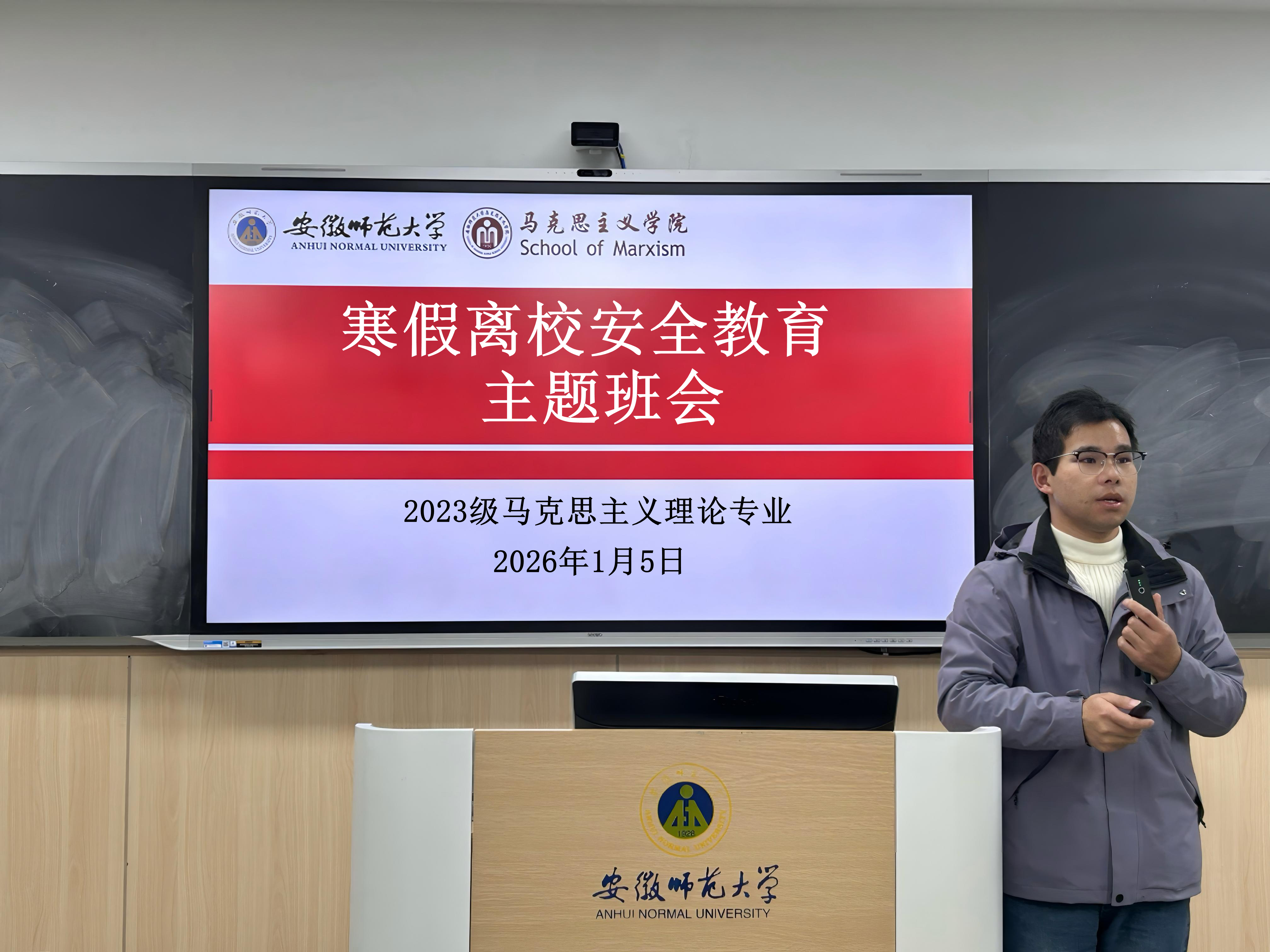 为进一步增强学生安全意识,确保全体同学度过一个平安、祥和的寒假,1月5日,2023级本科生分批次在望道楼E210教室组织召开寒假离校安全教育主题班会。本次班会由辅导员王梦雨主持,全体在校学生参与。