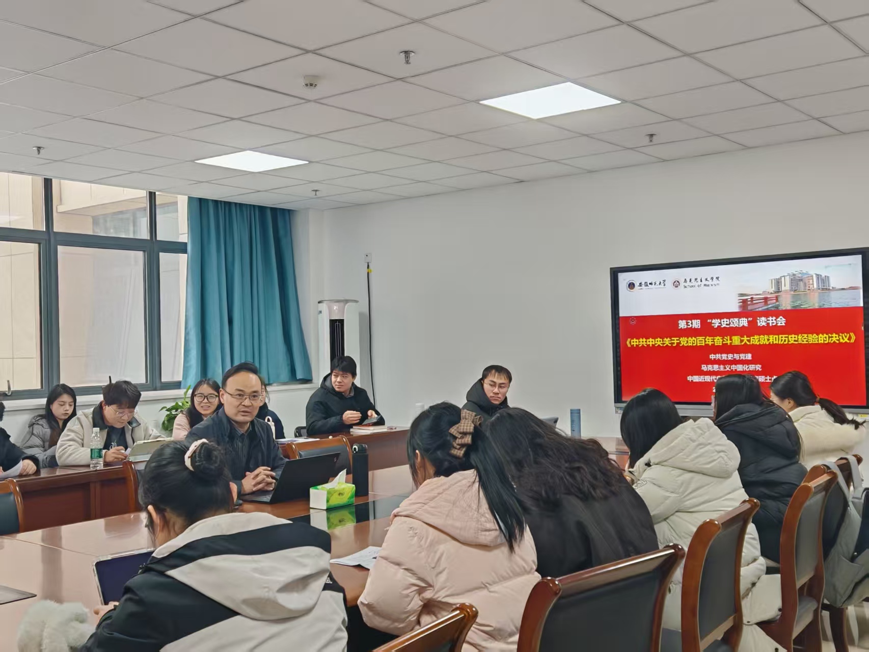 为了加强硕士研究生过程性培养,提升硕士研究生的阅读素养,1月5日下午,马克思主义中国化研究、中共党史与党建和中国近现代史基本问题研究三个硕士点在文典楼G211会议室共同举办第三期“学史颂典”读书会。马克思主义中国化研究硕士点负责人郭理老师指导本次活动,三个学位点2025级全体研究生参加读书会。