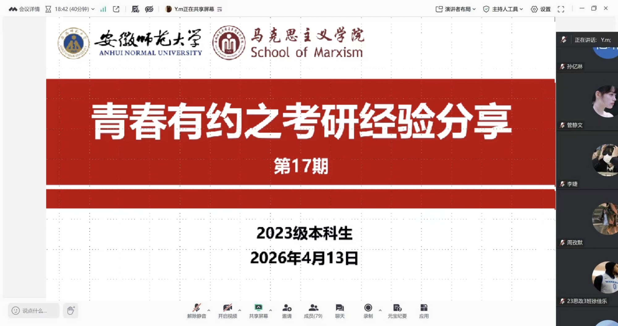 为帮助2023级本科生明晰考研方向、掌握备考方法,4月13日晚,马克思主义学院2023级本科生在线上开展第十七期“青春有约”之考研经验分享活动。本次活动由陈卓青主持,2022级思想政治教育专业王敏同学担任主讲人,2023级全体本科生参加。