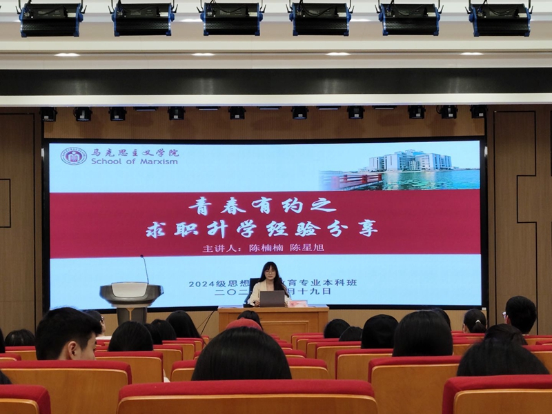 4月19日晚,马克思主义学院2024级思想政治教育专业本科班在望道楼E102开展青春有约之求职升学经验分享活动。本次活动由陈星旭、陈楠楠主讲,黄悦冉主持,全体同学参加。