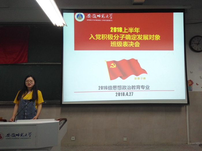 紧接着,宣凡宣布班会的第二项议程。班级的16位入党积极分子将向全体同学汇报自身的发展情况,并由全体同学公选出8名发展对象。思想坚定、一心向党,精益求精、敦品力学,惟日孜孜、无憾逸豫,感人心情、莫孚于情……,积极分子们用他们在学习、工作和服务等方面优异的事迹向同学们展示了她们的实践锻炼及成长成就。汇报结束,在班长和团支书的公开汇总唱票后,成功推选出本班的8名发展对象。